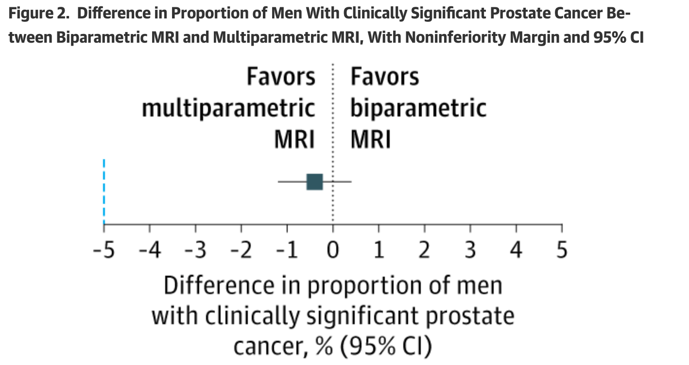 The trial had a non-inferiority margin of -5 percentage points: essentially, bpMRI would be deemed acceptable if it wasnβt more than 5 points worse than mpMRI at finding the important cancers.