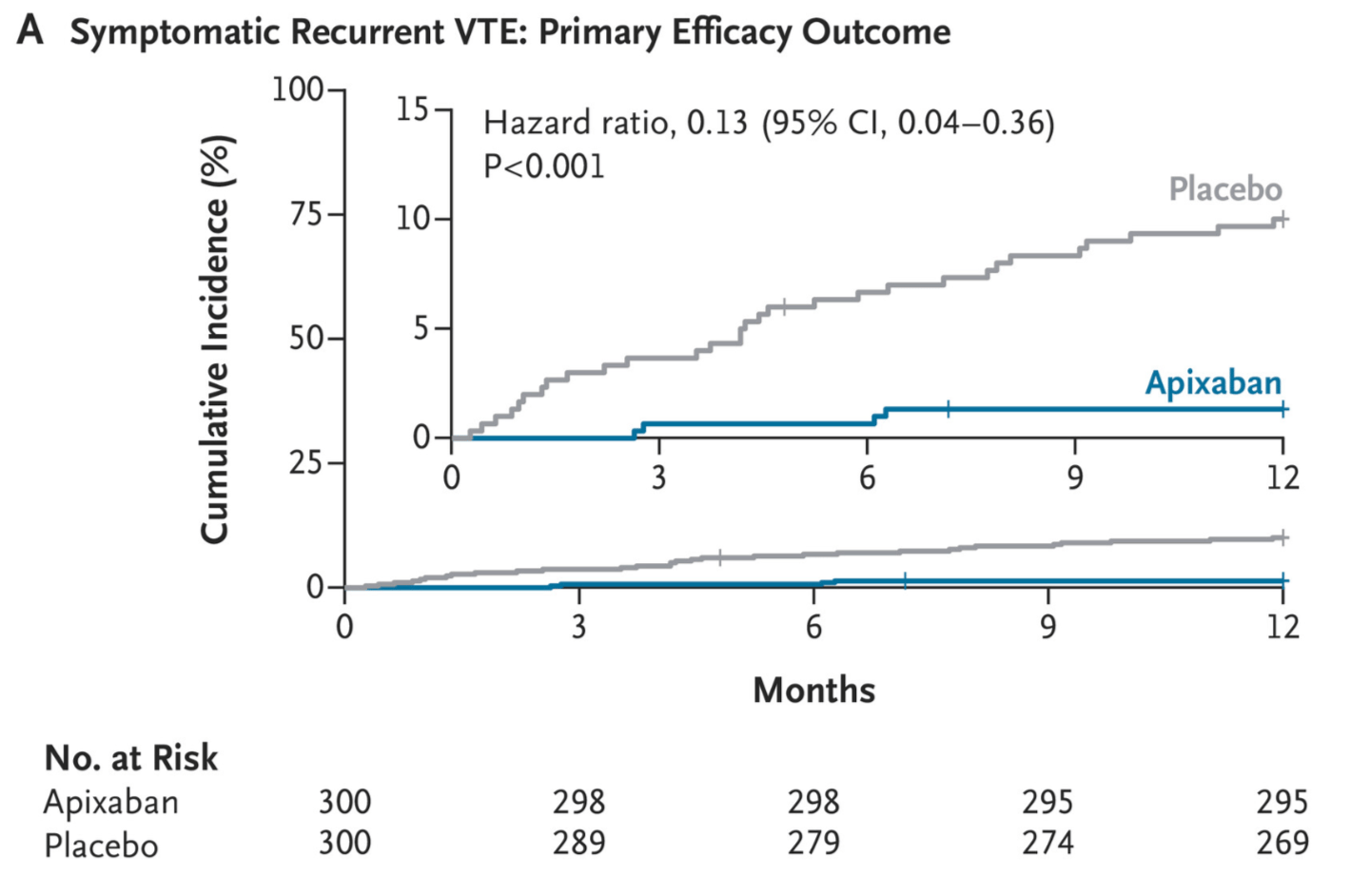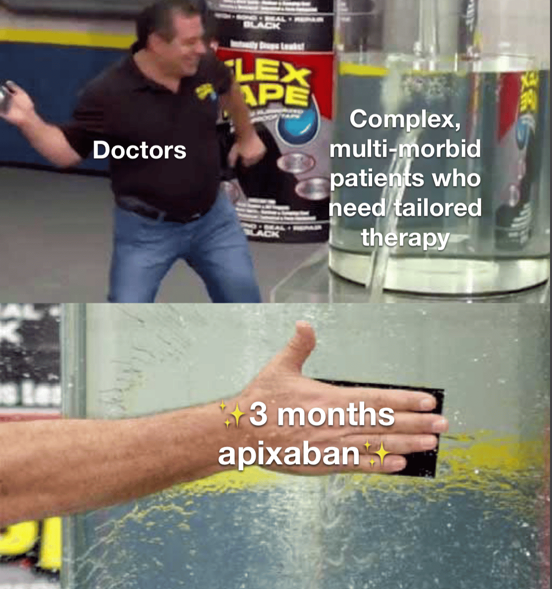 In this trial, the unlucky placebo group had a 10% recurrence rate at 12 months. So it’s giving less “safe to stop”, more #apixaban4lyfe.