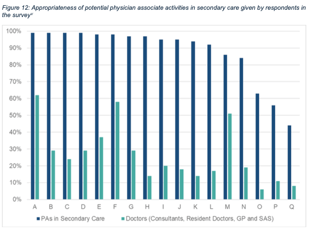 The doctors’ approval rating wasn’t quite the same… only 3 of those 17 tasks even scraped above a 40% approval rating from doctors. The three that doctors were semi-okay with PAs doing were providing health promotion and prevention advice (62%), supporting research and audits (58%) and delivering immunisation (51%).