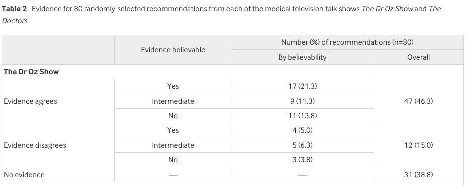 A BMJ analysis of popular medical talk shows found that only around half of the recommendations were supported by evidence, with many lacking evidence entirely or even contradicting it.