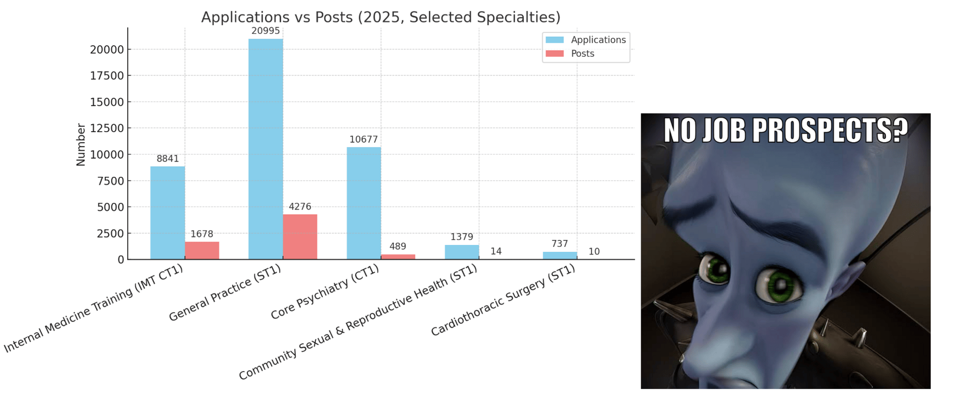 Consider that bubble officially burst - the 2025 reality is roughly 7 applicants per specialty training post, up a whopping from 4.7 last year. Which is fine. This is fine.Β